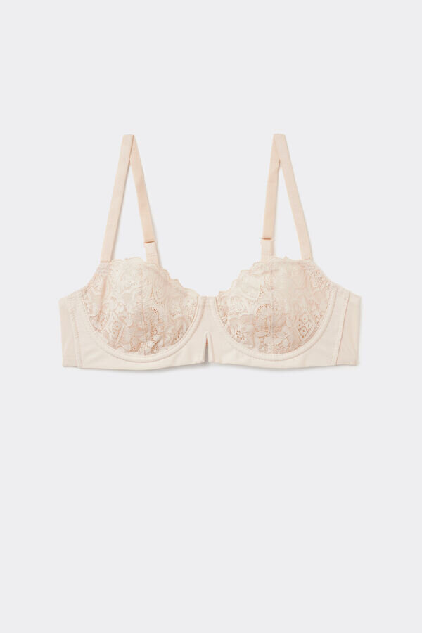 denise balconette-bh med myke, elastiske blonderkopper og mikrofiberunderbånd pyntet med en raffinert v-wire-detalj. den har et perfekt design for å fremheve dekolletéen takket være den dype utringningen og koppene som løfter og runder brystet uten polstring. den sitter godt og er behagelig, og skaper en svært sensuell og spennende effekt selv for mindre bryster.