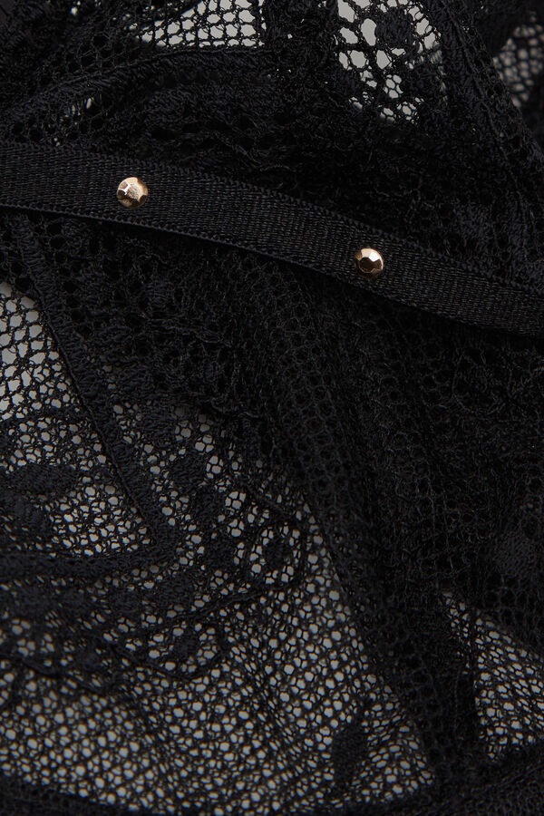 demilune balconette-bh i myk stretchblonder med geometrisk motiv kombinert med elegant prikkete tyll. Den har et elastisk motiv ved dekolletéen og gullnitter på stroppene. Liten sløyfe i midten av brystet med gullkant. Den sitter godt og er behagelig, og gir en svært sensuell og spennende effekt selv for mindre bryster.