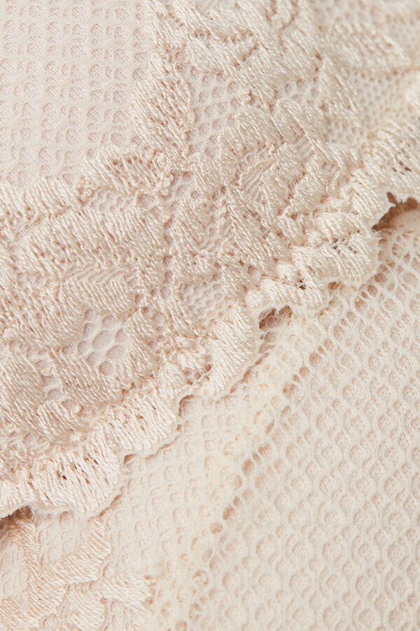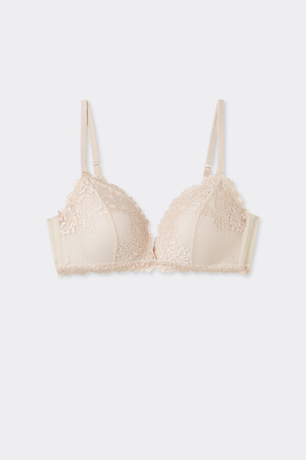 tiziana trådløs triangel-bh med lett polstrede kopper og sideben som delikat former brystet. den er laget av sofistikert og elegant stretchblonder med enten tone-i-tone eller kontrastfarget blomsterbroderi, avhengig av hvilken versjon som presenteres. stroppene er fôret med mikrofiber og kan justeres i ryggen. Denne BH-en former brystet på en delikat måte og gir lett støtte.