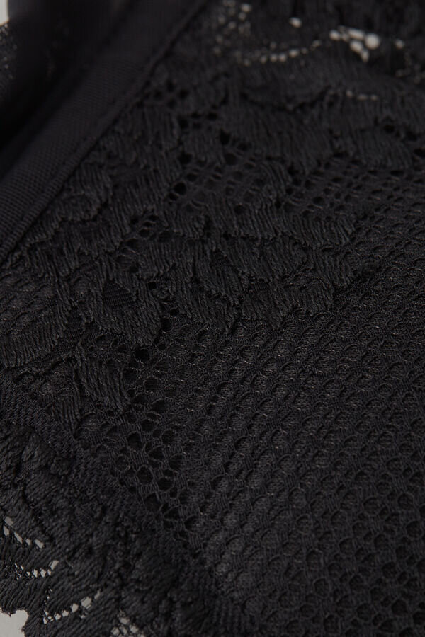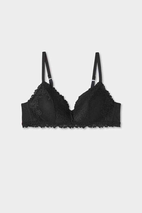 tiziana trådløs triangel-bh med lett polstrede kopper og sideben som delikat former brystet. den er laget av sofistikert og elegant stretchblonder med enten tone-i-tone eller kontrastfarget blomsterbroderi, avhengig av hvilken versjon som presenteres. stroppene er fôret med mikrofiber og kan justeres i ryggen. Denne BH-en former brystet på en delikat måte og gir lett støtte.