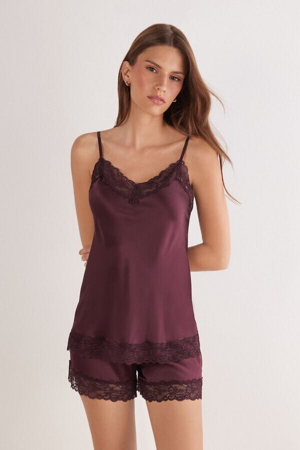 silketopp med V-hals og justerbare spaghettistropper, pyntet med blonder i halsen og nederst. perfekt som undertøy og under en jakke. Modellen er 175 cm høy og bruker størrelse S.