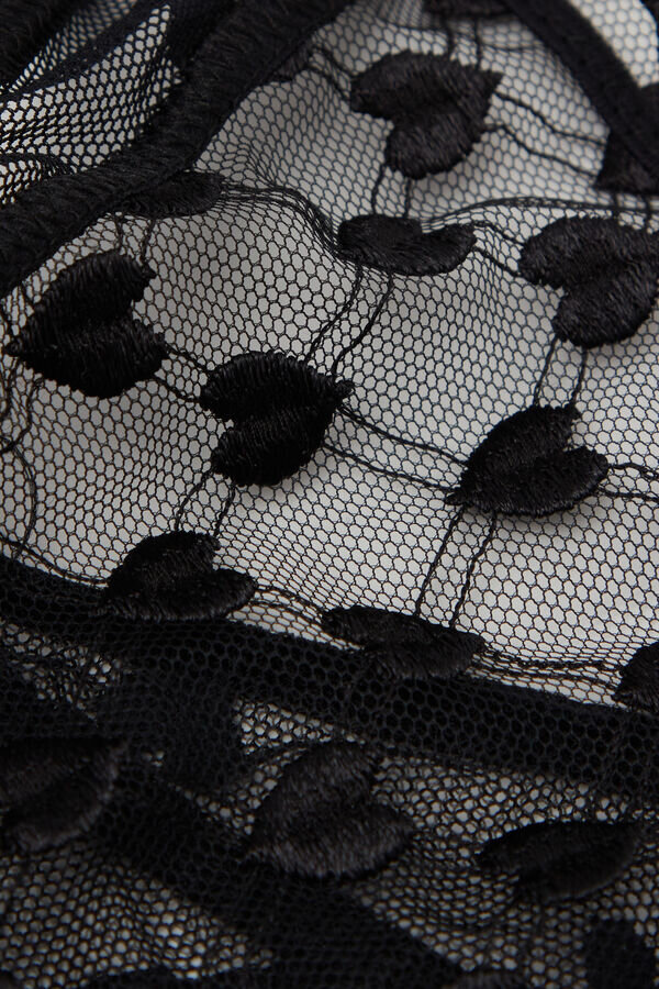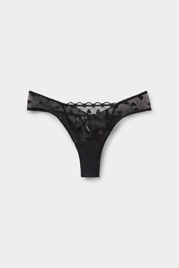 Brazilian truse i romantisk tyll med hjertebroderi, pyntet på baksiden med hjertevolanger og satengdetaljer. satengstroppen er avtakbar og kan også brukes som en frekk choker eller hårpynt.