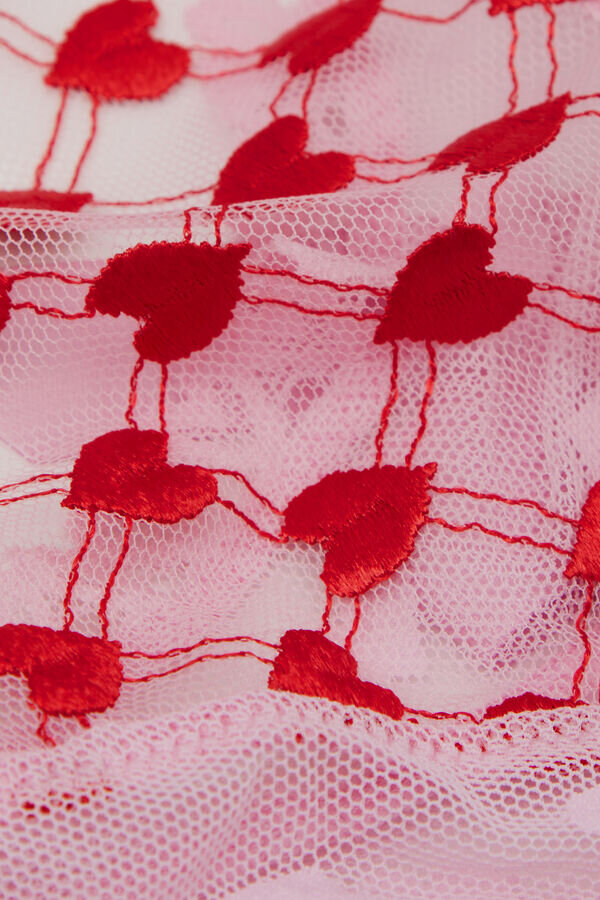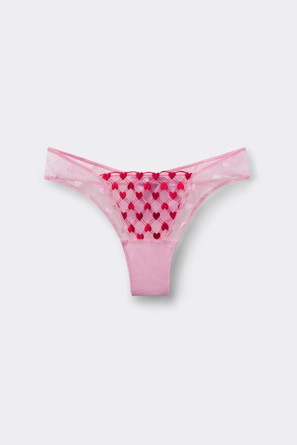 Brazilian i romantisk tyll med hjertebroderi, pyntet på baksiden med hjertevolanger og satengdetaljer. satengstroppen er avtakbar og kan også brukes som en frekk choker eller hårpynt.