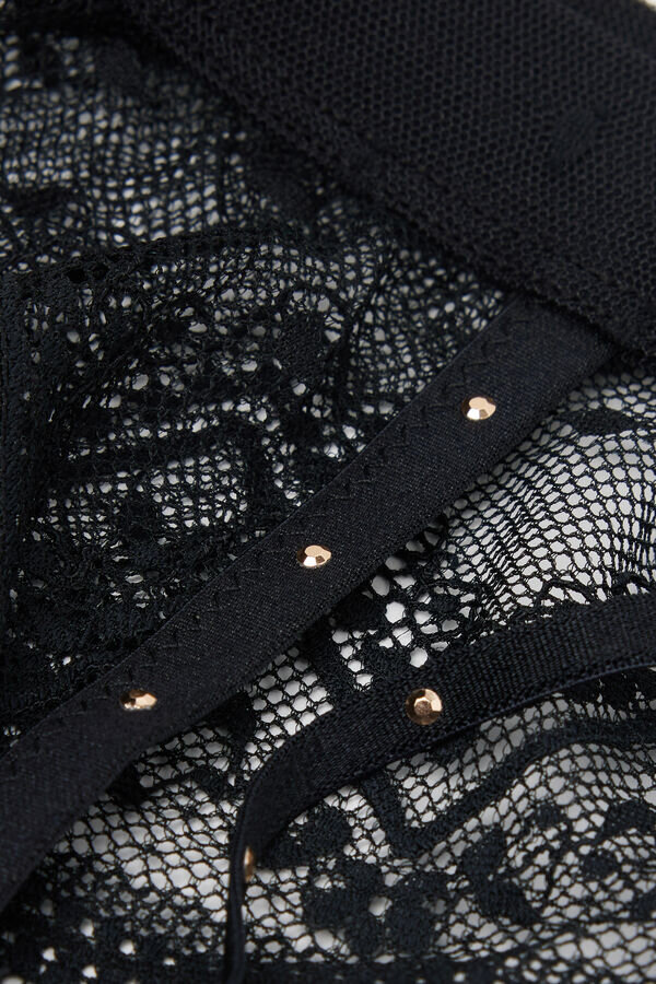 strømpebånd i myk stretchblonder med prikkete tyllkant og mykt elastisk motiv med nitter. liten sløyfe med gullkant.