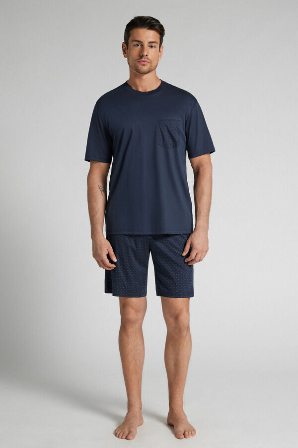 kort pyjamas med myk, ensfarget premium mercerisert bomullsskjorte med lomme med prikkmønster. shortsen har også prikkmønster.