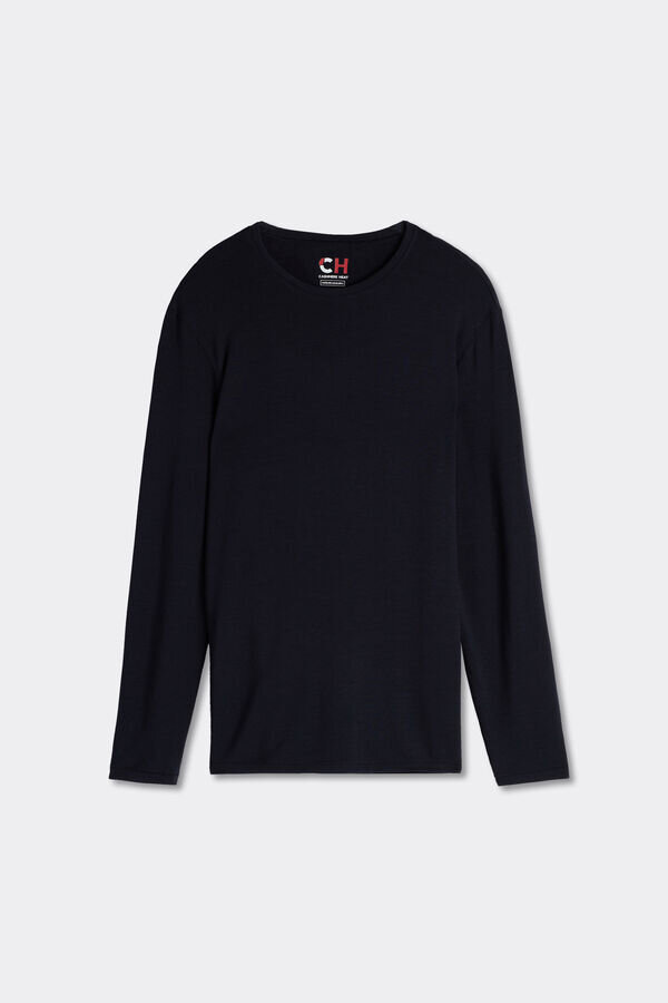 langermet topp med rund hals for menn i en blanding av modal og kashmir. utrolig myk og behagelig. modellen er 185 cm høy og bruker størrelse l. selges i Intimissimi-butikker.
