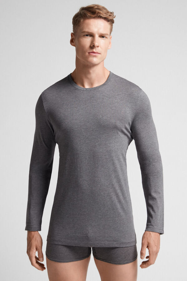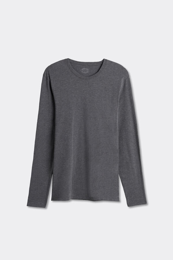 langermet topp med rund hals i 100 % førsteklasses bomull. fiberen er av høyeste kvalitet, utrolig myk og pustende, og har optimal elastisitet selv om den ikke inneholder elastan. Stoffets struktur garanterer utmerket holdbarhet ved vask. En enkel og behagelig topp, ideell å bruke til enhver anledning, enten som undertøy eller alene.