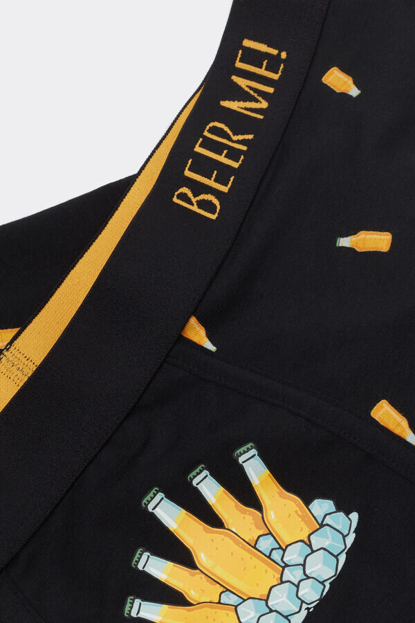 boxershorts for menn i myk, lett stretchbomull av høy kvalitet med ølflaske-trykk over hele plagget og en iskald ølflaske på frontlommen. synlig, myk elastikk med morsomt «beer me!»-trykk.